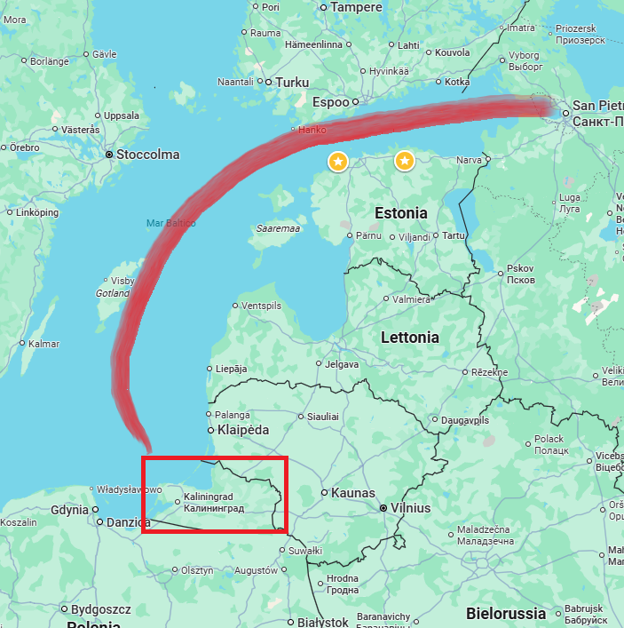 Iniziamo subito con l’immagine qui sotto che indica il percorso che fanno gli aerei della Federazione Russa per spostarsi dalla regione di San Pietroburgo all’exclave di Kaliningrad, posta tra la Polonia e la Lituania. La rotta è autorizzata e consente il collegamento tra i due territori Russi passando, ovviamente, sopra le repubbliche baltiche in una aerovia molto stretta a poche decine di km dall’Estonia.